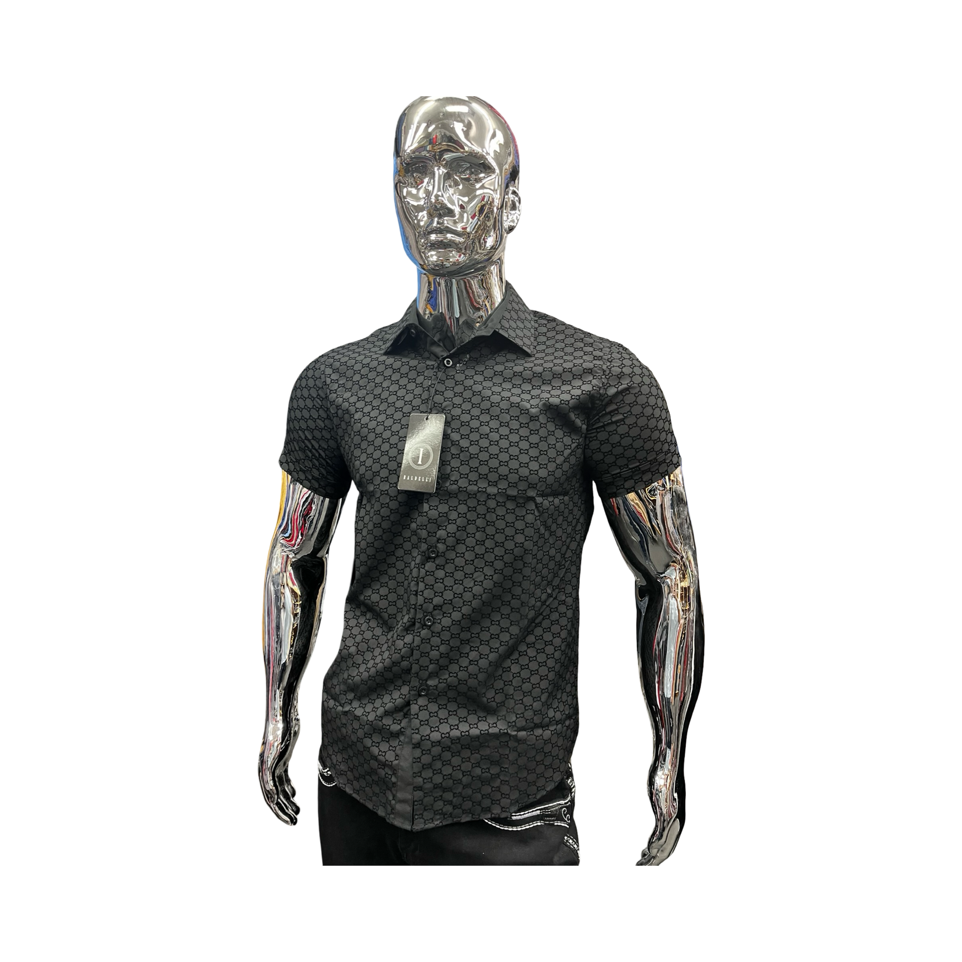 Camisa de manga corta para hombre con diseño geométrico moderno en color negro. Ideal para un look elegante y contemporáneo, perfecta para ocasiones casuales o salidas nocturnas. Tela ligera, cómoda y de excelente ajuste.