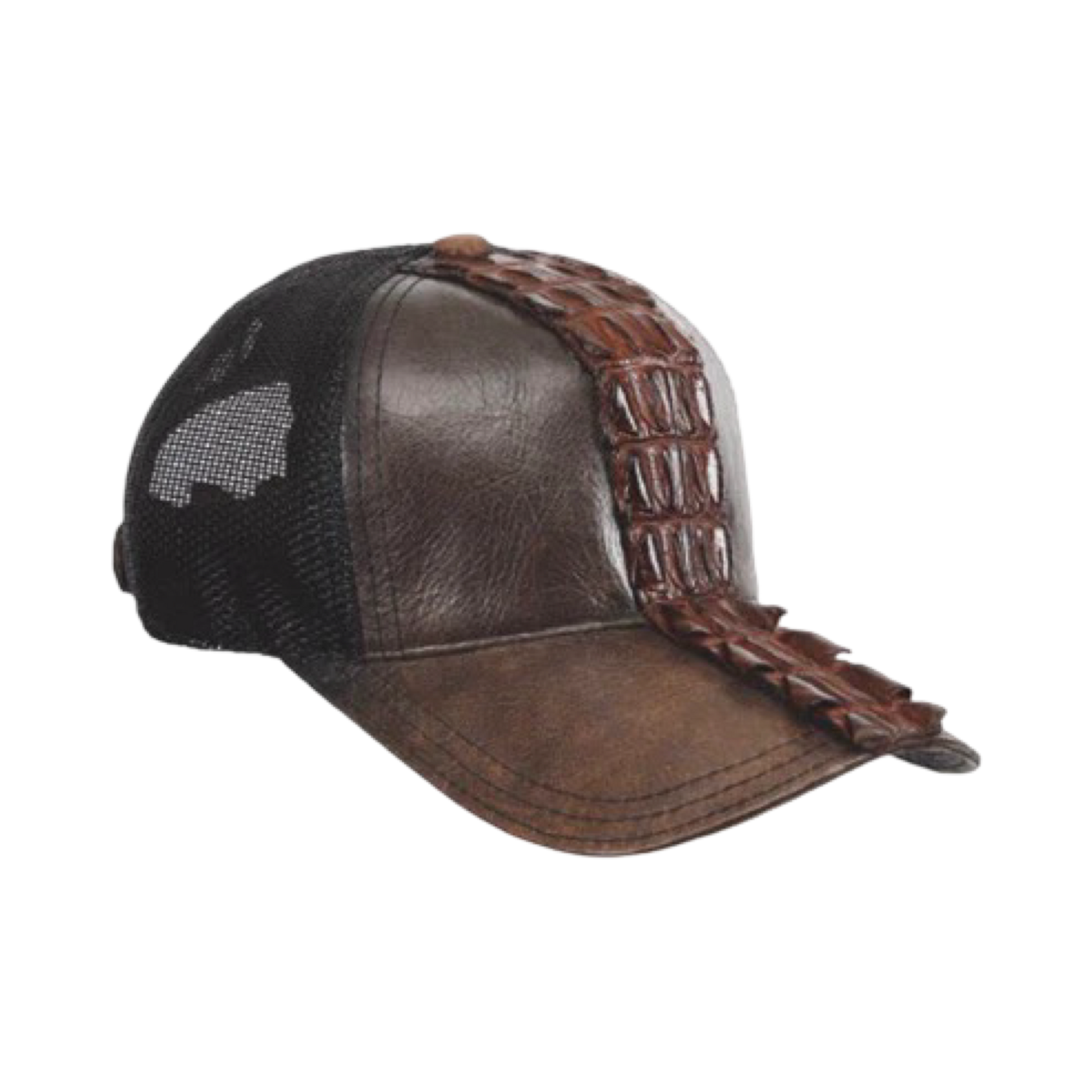 Elegante gorra vaquera elaborada en auténtica piel de cocodrilo color chocolate. Perfecta para quienes buscan un look sofisticado y rústico a la vez.